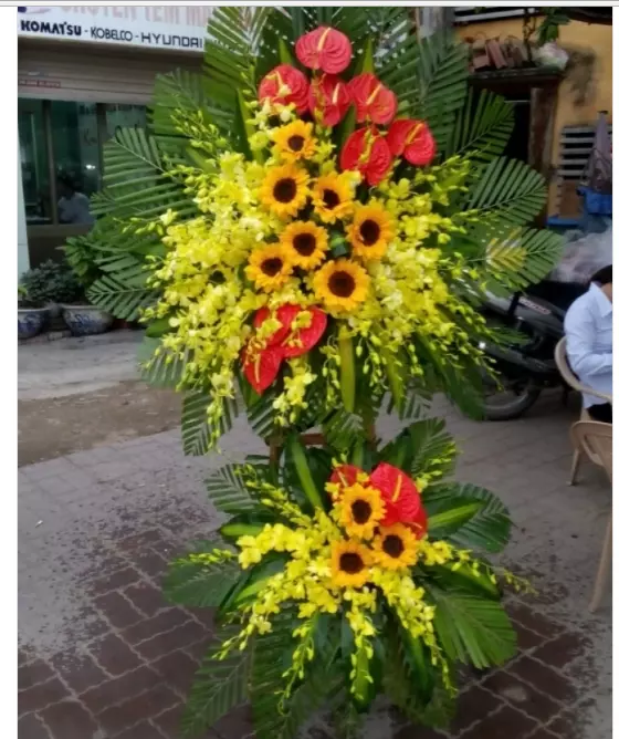 Hoa chúc mừng tông màu vàng đỏ với sự kết hợp của hoa lan mokara đỏ, hồng đỏ hồng môn đỏ và hoa đồng tiền đỏ. Tone màu vàng của hoa lan vàng và mokara vàng. Mang màu sắc của may mắn, và thành công, kệ hoa gửi tới quý công ty, doanh nghiệp lời chúc Thành công và phát triển.