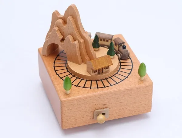 Hộp nhạc phát nhạc bằng cót, đoàn tàu chạy xung quanh.