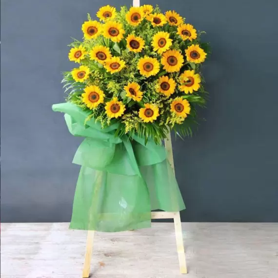 Kệ hoa khai trương lộc tài được thiết kế theo tone màu vàng và chọn hoa hướng dương làm hoa chính. Màu vàng tượng trưng cho sự tài lộc, trong khi đó hoa hướng dương tượng trưng cho niềm tin và chiến thắng. Mẫu kệ hoa chúc mừng lộc tài giúp bạn gửi đến đối tác, người thân lời chúc khai trương phát tài, phát lộc.