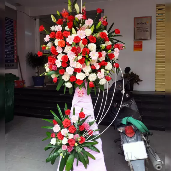Khoảnh khắc tươi đẹp và huy hoàng nhất trong một ngày chính là khi mặt trời bắt đầu ló dạng toả ra thứ ánh sáng chói loà mà ấm áp đến muôn nơi cũng giống như một lời chúc, mong ước cho sự nổi tiếng và việc kinh doanh được lan rộng, ngày càng phát đạt và thịnh vượng. Dựa trên ý tưởng đó mẫu hoa khai trương phồn vinh đã được thiết kế với tông đỏ và hồng từ những bông hồng và đồng tiền tươi thắm để mô tả lại hình ảnh tươi đẹp ấy.