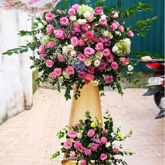 Kệ Hoa Khai Trương Phú Quý đầy phá cách, không mang tông màu vàng, đỏ truyền thống, kệ hoa mang tông màu hồng đầy sáng tươi được tạo nên từ các loại hoa hồng dâu, hồng trắng được phối hợp hài hòa. Kệ hoa có thể là một lời chúc mừng khai trương đầy an khanh, thịnh vượng cũng có thể là một lời chúc mừng cho những dịp cưới hỏi của bạn bè, người thân.